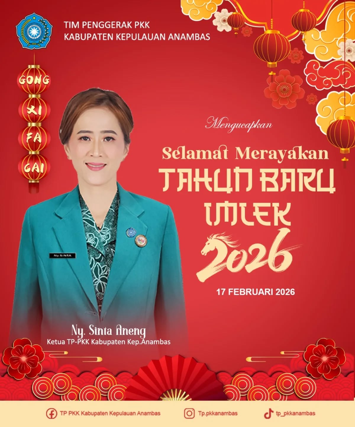 Atas nama Tim Penggerak PKK Kabupaten Kepulauan Anambas, Ny. Sinta Aneng Ketua TP- PKK Kabupaten Kepulauan Anambas mengucapkan Selamat Tahun Baru Imlek 2026 Masehi/2577 Kongzili.