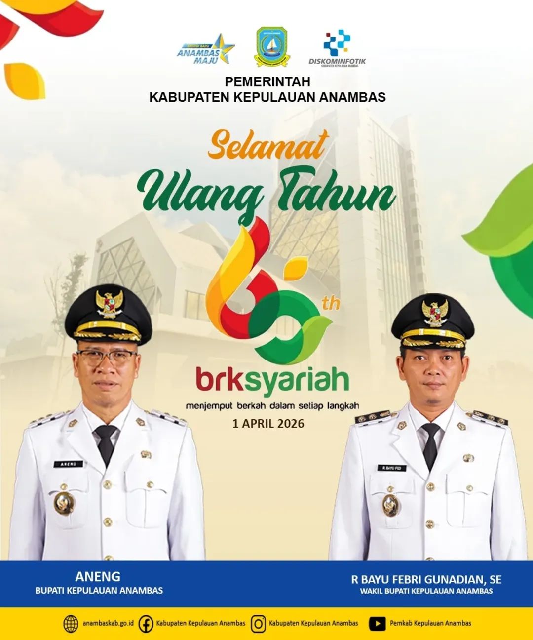 Pemerintah Kabupaten Kepulauan Anambas Mengucapkan Selamat Ulang Tahun Ke-60 BRK Syariah. Semoga Terus Berkembang, memberikan layanan terbaik, serta menjadi mitra strategis dalam pembangunan daerah dan peningkatan kesejahteraan masyarakat