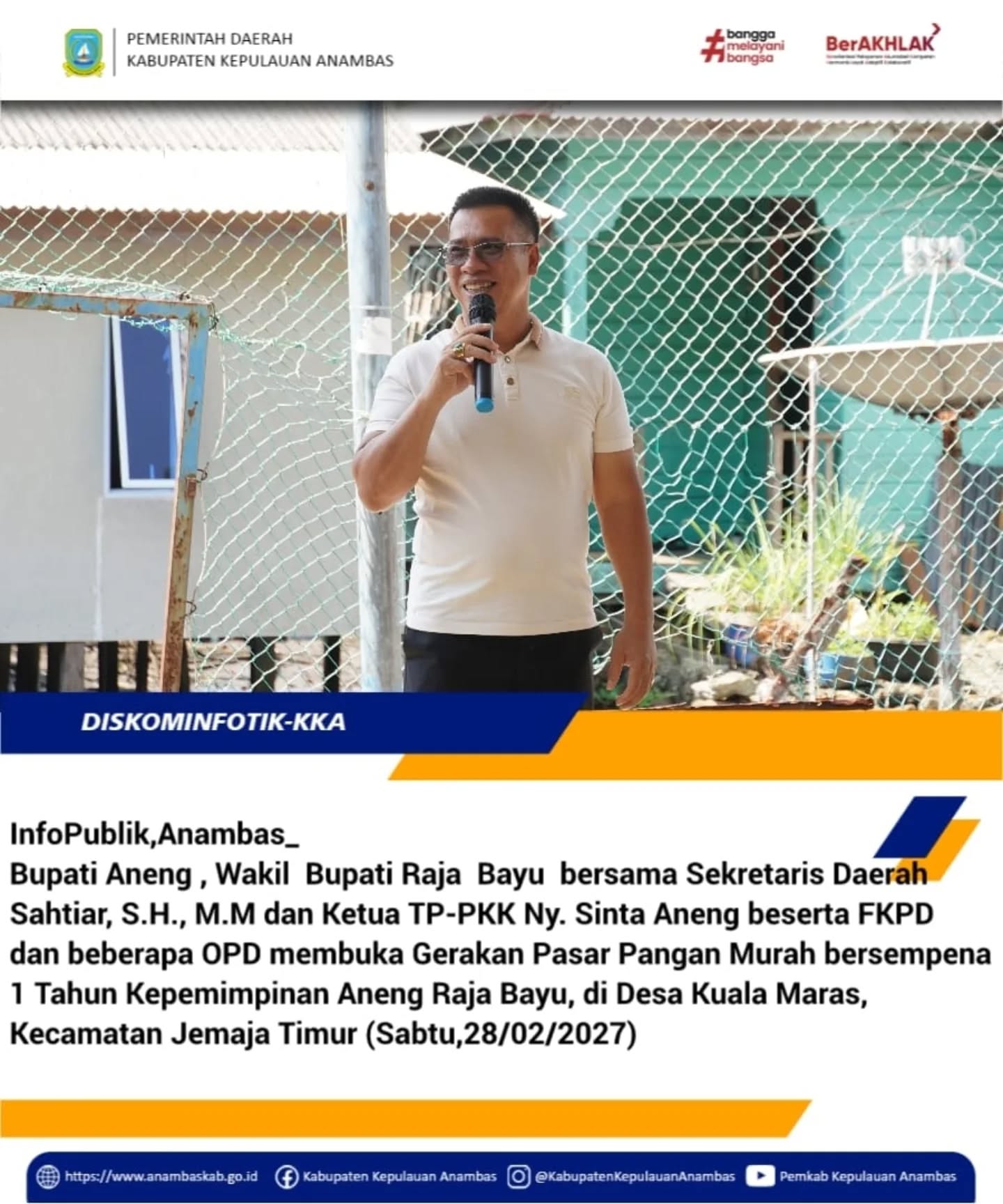 Masih dalam rasa syukur atas 1 Tahun Kepemimpinan Aneng Raja Bayu, Bupati Kepulauan Anambas Aneng, bersama Wakil Bupati Raja Bayu, Sekretaris Daerah Sahtiar S.H., M.M, serta Ketua TP-PKK Sinta Aneng, didampingi unsur FKPD dan sejumlah Kepala OPD terkait secara resmi membuka Gerakan Pasar Pangan Murah di Desa Kuala Maras, Kecamatan Jemaja Timur.