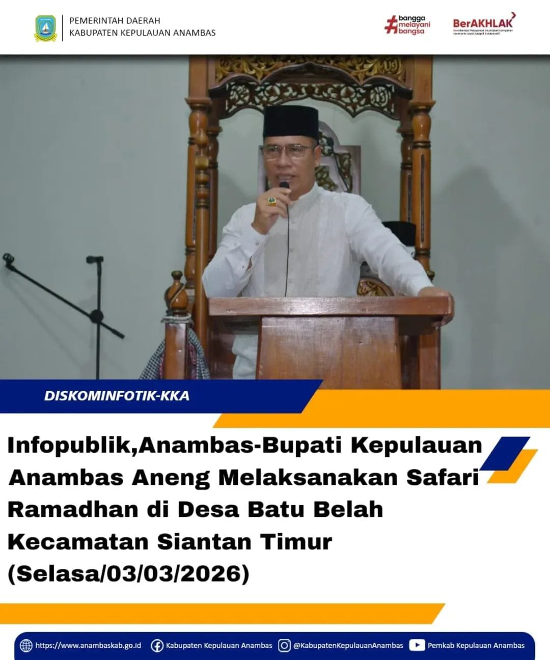 Bupati Kepulauan Anambas, Bapak Aneng, didampingi Sekretaris Daerah Sahtiar, jajaran FKPD serta para Kepala OPD, melaksanakan kegiatan Safari Ramadhan di Desa Batu Belah, Kecamatan Siantan Timur.