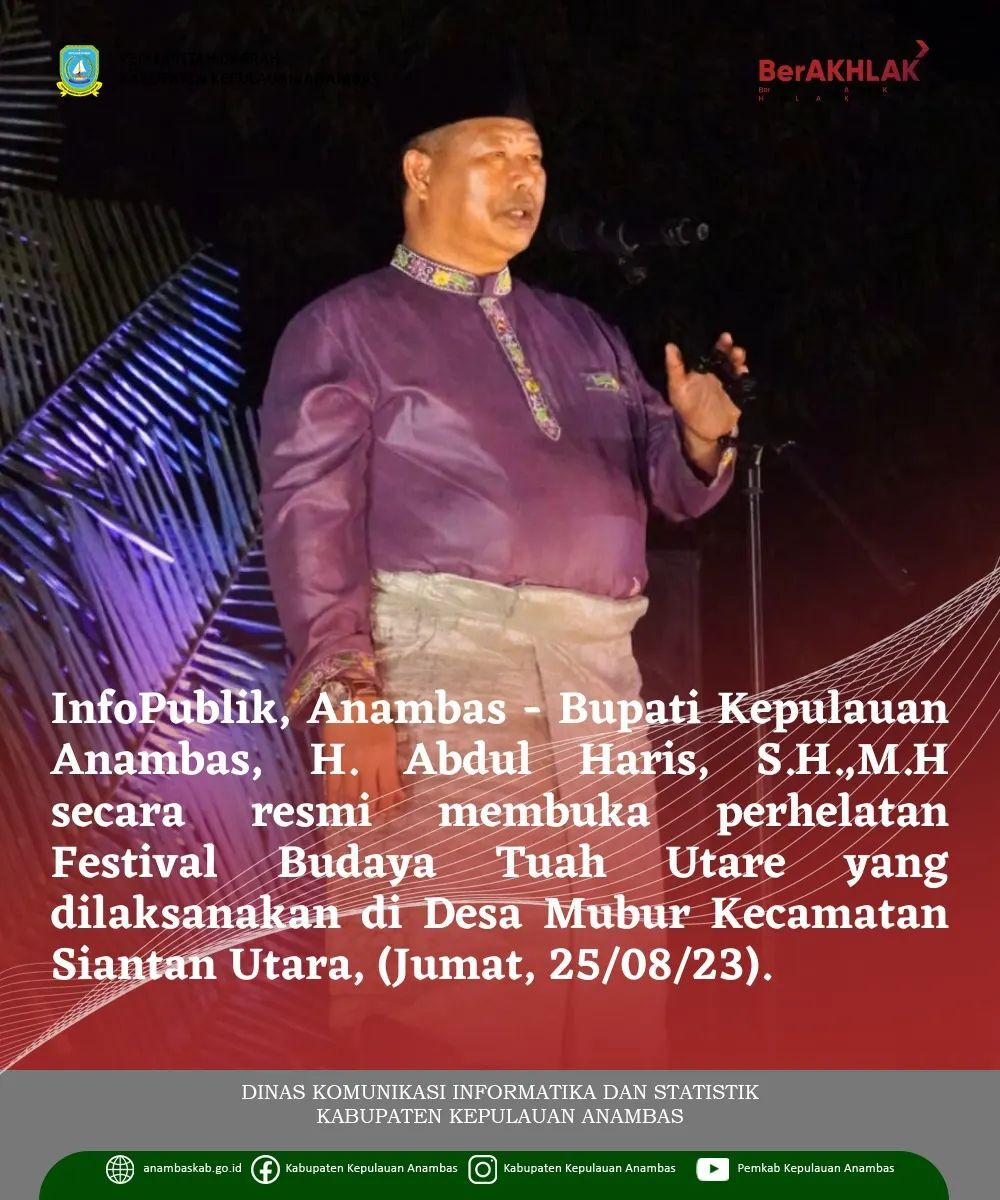 InfoPublik, Anambas - Bupati Kepulauan Anambas, H. Abdul Haris, S.H.,M.H secara resmi membuka perhelatan Festival Budaya Tuah Utare yang dilaksanakan di Desa Mubur Kecamatan Siantan Utara, (Jumat, 25/08/23).