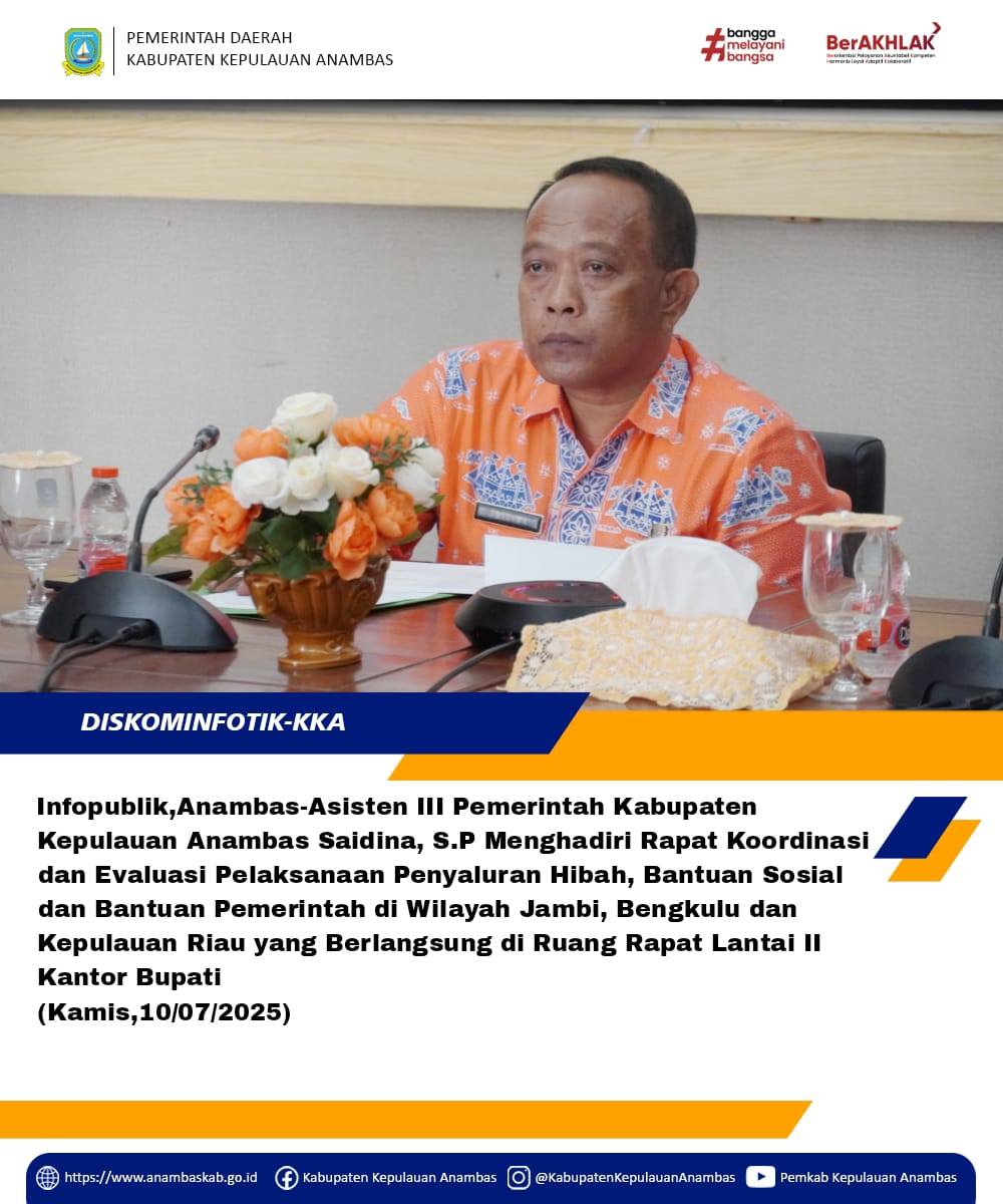 InfoPublik, Anambas - Asisten Bidang Administrasi Umum Setda KKA, Saidina, S.P mewakili Wakil Bupati Kepulauan Anambas memimpin Rapat Koordinasi dan Evaluasi Pelaksanaan Hibah, Bantuan Sosial dan Bantuan Pemerintah di Wilayah Jambi, Bengkulu dan Kepulauan Riau, Kegiatan ini berlangsung di Ruang Rapat, Lt II Kantor Bupati Kepulauan Anambas - Pasir Peti, (Kamis,10/07/2025).