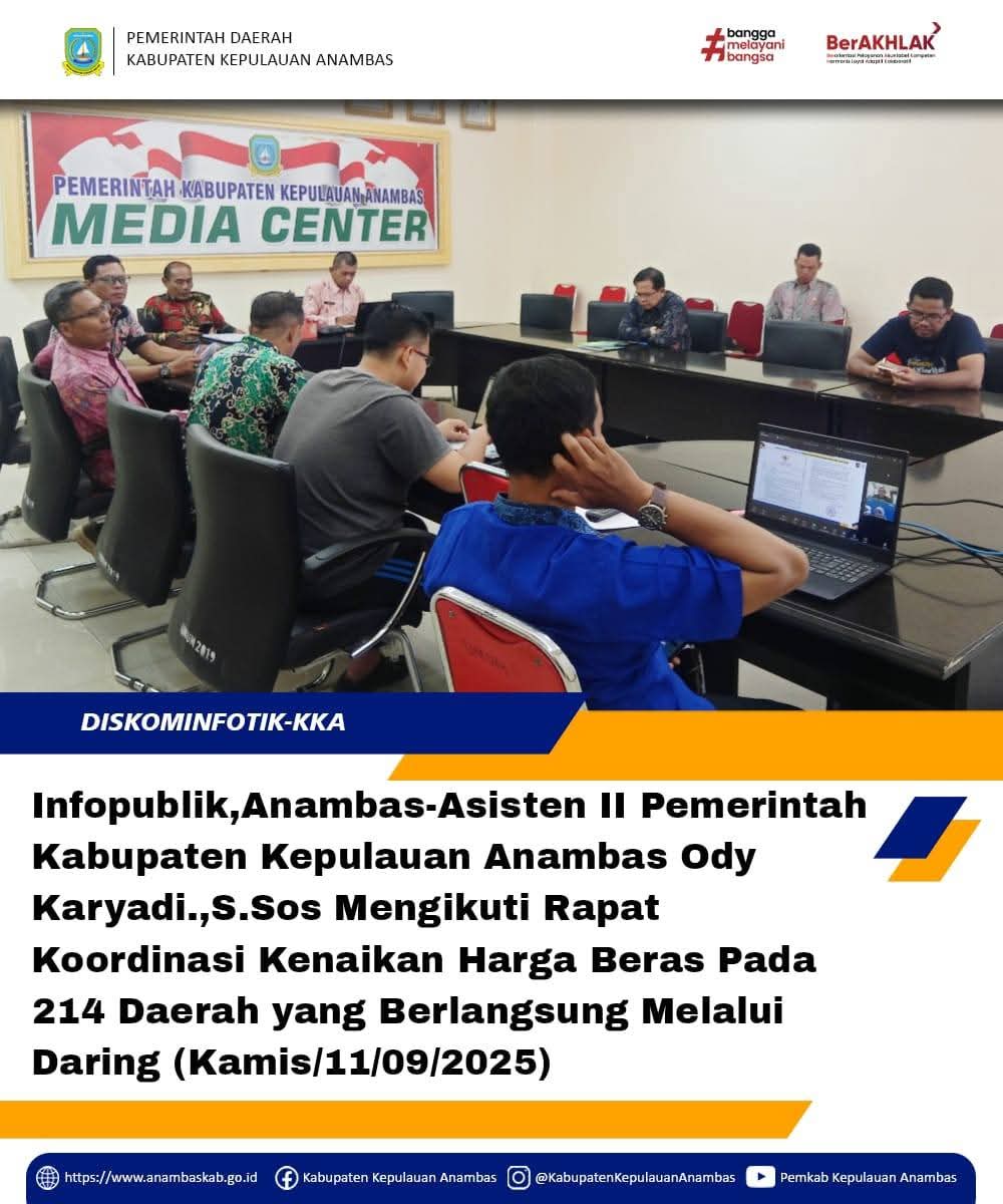 Rapat koordinasi digelar guna merespons dinamika kenaikan harga beras yang berdampak langsung terhadap stabilitas ekonomi masyarakat di Kabupaten Kepulauan Anambas. Melalui koordinasi lintas sektor, diharapkan lahir langkah strategis dan solutif dalam menjaga ketersediaan, keterjangkauan, serta kestabilan harga beras di daerah. Bersama, kita pastikan kebutuhan pokok masyarakat tetap terpenuhi dengan baik.”Ody Karyadi Asisten Perekonomian dan Pembangunan Sekretariat Daerah Kabupaten Kepulauan Anambas
