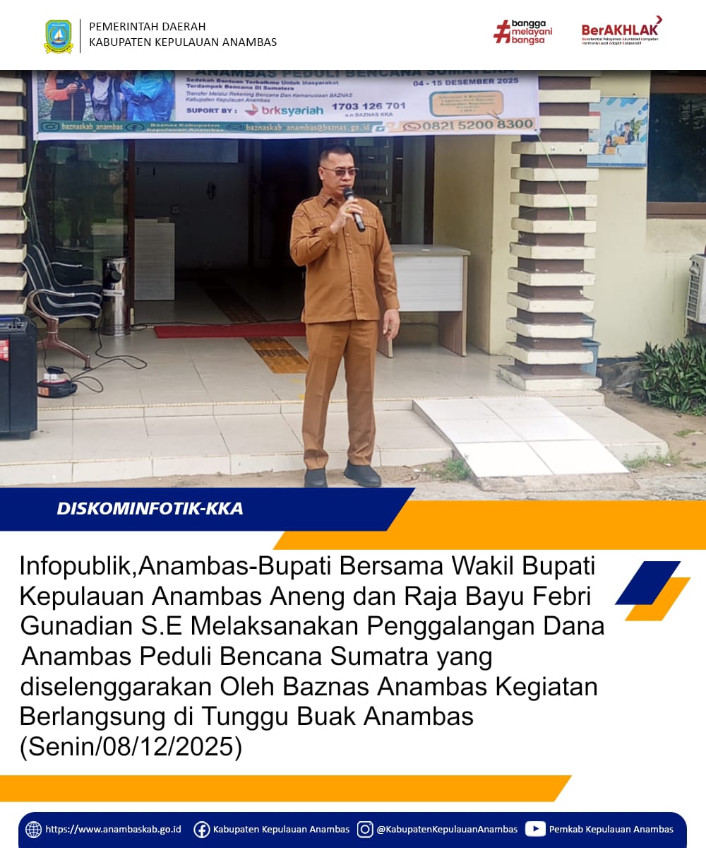 Infopublik,Anambas - Bupati Bersama Wakil Bupati Kabupaten Kepulauan Anambas Aneng dan Raja bayu Febri Gunadian,S.E Melaksanakan Penggalangan Dana Anambas Peduli Bencana Sumatera yang diselenggarakan Oleh Baznas Anambas Kegiatan Berlangsung di Tunggu Buak Anambas (Senin,08/12/2025)