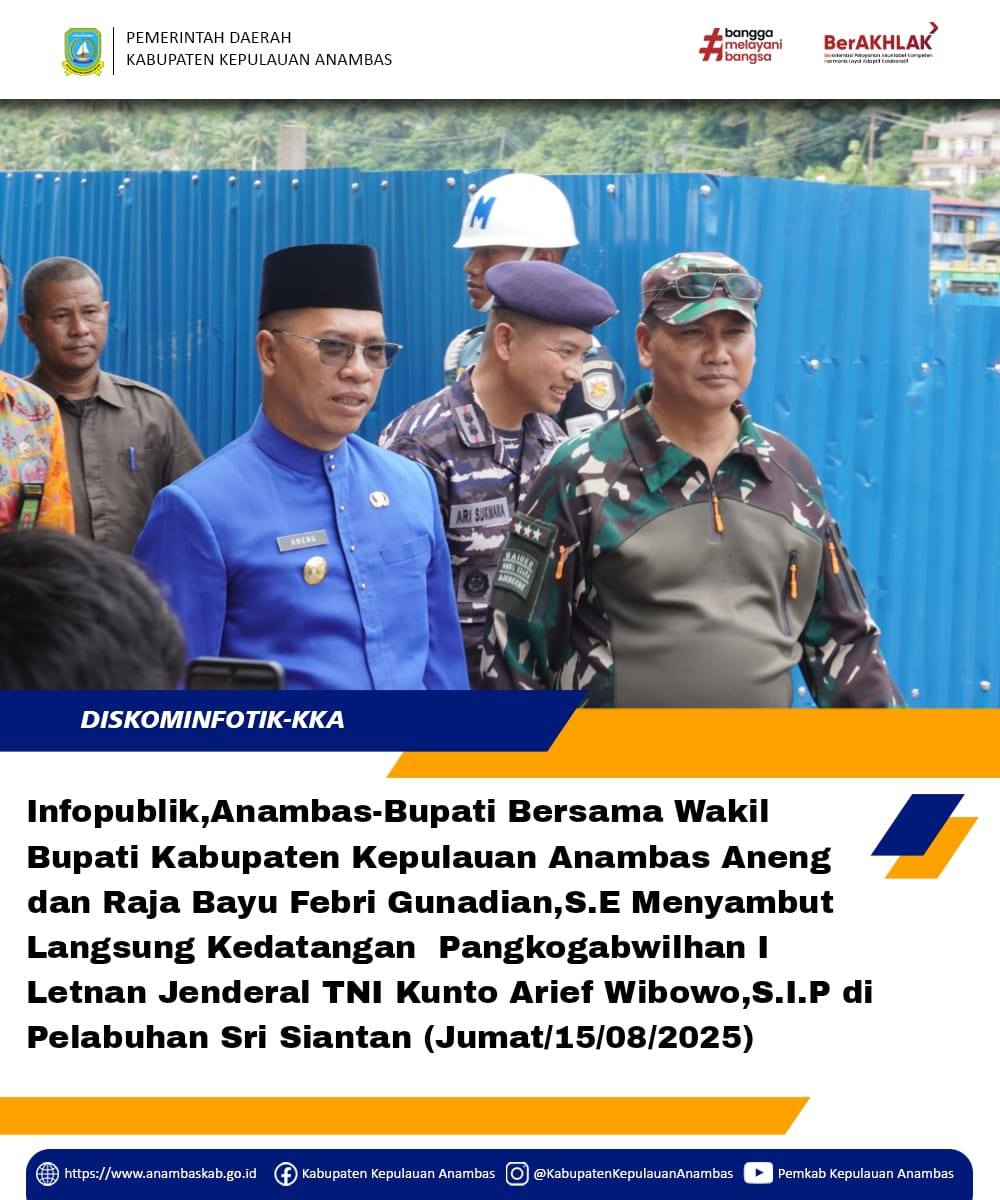 Infopublik,Anambas Bupati Bersama Wakil Bupati Kabupaten Kepulauan Anambas Aneng dan Raja Bayu Febri Gunadian,S.E Menyambut Langsung Kedatangan Pangkogabwilhan I Letnan Jenderal TNI Kunto Arief Wibowo,S.I.P di Pelabuhan Sri Siantan (Jum'at,15/08/2025)