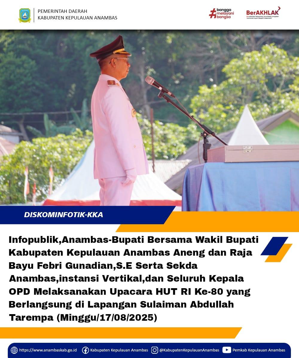 Di bawah kibaran bendera, kita diajak untuk terus menumbuhkan semangat gotong royong, memperkokoh persaudaraan, dan bekerja bersama demi mewujudkan cita-cita luhur bangsa. Merah Putih yang berkibar di langit negeri perbatasan Kabupaten Kepulauan Anambas adalah saksi perjalanan panjang Indonesia, dari perjuangan hingga kemerdekaan, serta komitmen kita untuk menjaga, mengisi, dan melanjutkan pembangunan menuju Indonesia Maju,"Aneng Bupati Kepulauan Anambas.