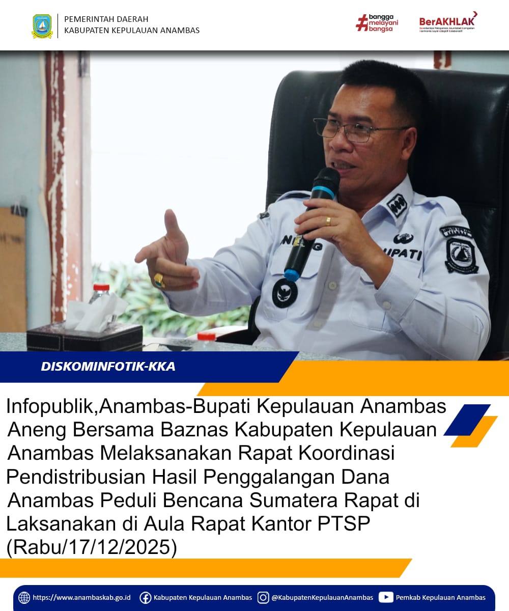 Infopublik,Anambas - Bupati Kabupaten Kepulauan Anambas Aneng Bersama Baznas Kabupaten Kepulauan Anambas Melaksanakan Rapat Koordinasi Pendistribusian Hasil Pengalangan Dana Anambas Peduli Bencana Sumatera Rapat di Laksanakan di Aula Rapat Kantor PTSP (Rabu,17/12/2025)