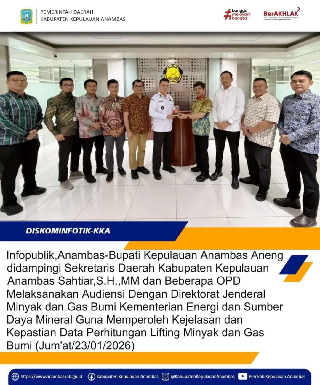 Infopublik,Anambas- Bupati Kabupaten Kepulauan Anambas Aneng didampingi Sekretaris Daerah Kabupaten Kepulauan Anambas Sahtiar,S.H.,MM dan Beberapa OPD Melaksanakan Audiensi Dengan Direktorat Jenderal Minyak dan Gas Bumi Kementerian Energi dan Sumber Daya Mineral Guna Memperoleh Kejelasan dan Kepastian Data Perhitungan Lifting Minyak dan Gas Bumi (Jum'at,23/01/2026)