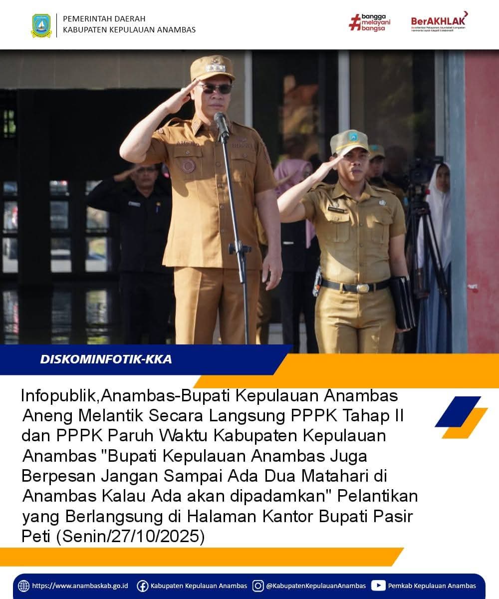 Infopublik, Anambas_ Bupati Kepulauan Anambas Aneng Melantik Secara Langsung PPPK Tahap II dan PPPK Paruh Waktu Kabupaten Kepulauan Anambas "Bupati Kepulauan Anambas Juga Berpesan Jangan Sampai Ada Dua Matahari di Anambas Kalau Ada akan dipadamkan" Pelantikan yang Berlangsung di Halaman Kantor Bupati Pasir Peti (Senin/27/10/2025 )