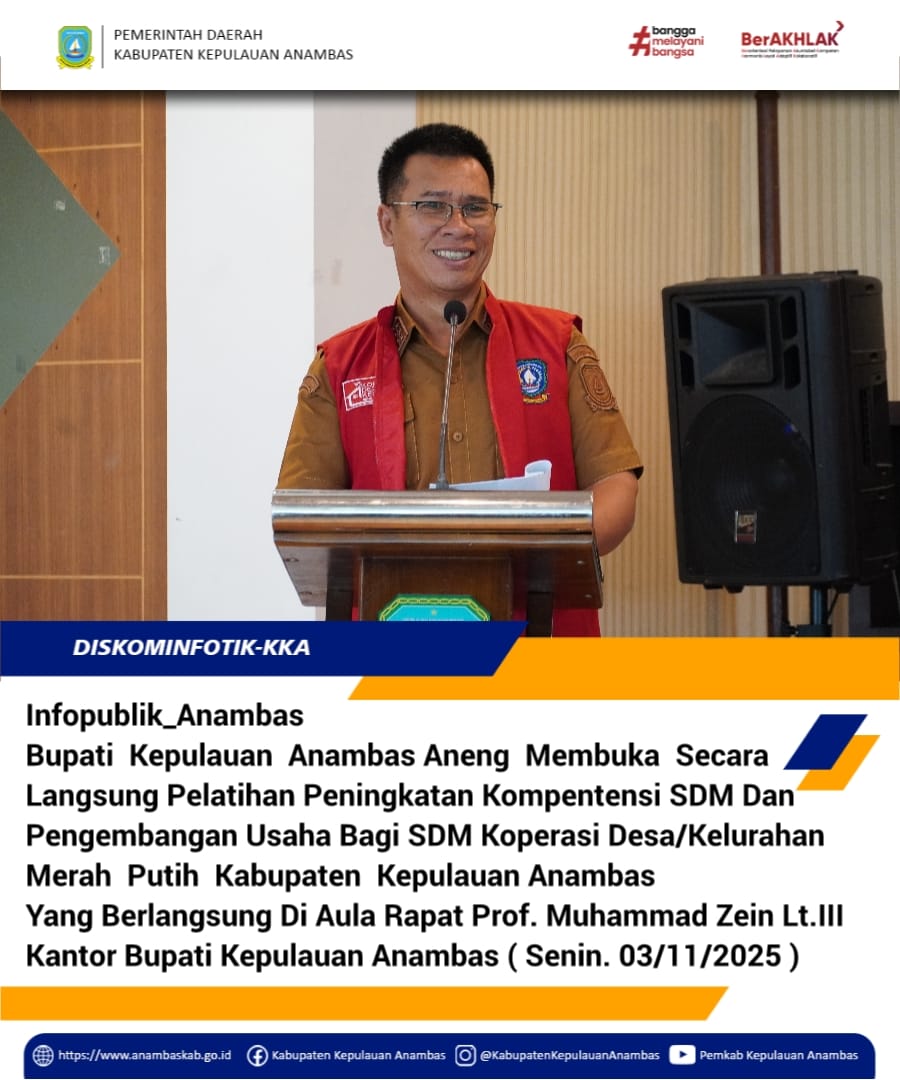 InfoPublik, Anambas— Pemerintah Kabupaten Kepulauan Anambas melalui Dinas Koperasi, Usaha Mikro, Perdagangan dan Perindustrian (DKUMPP) Kabupaten Kepulauan Anambas menyelenggarakan Pelatihan Peningkatan Kompetensi Sumber Daya Manusia (SDM) dan Pengembangan Usaha bagi SDM Koperasi Desa/Kelurahan Merah Putih, bertempat di Ruang Rapat Prof. M. Zen Lt. III Kantor Bupati Kepulauan Anambas - Pasir Peti., Kegiatan ini dibuka secara resmi oleh Aneng Selaku Bupati Kepulauan Anambas, Senin (03/11/2025)