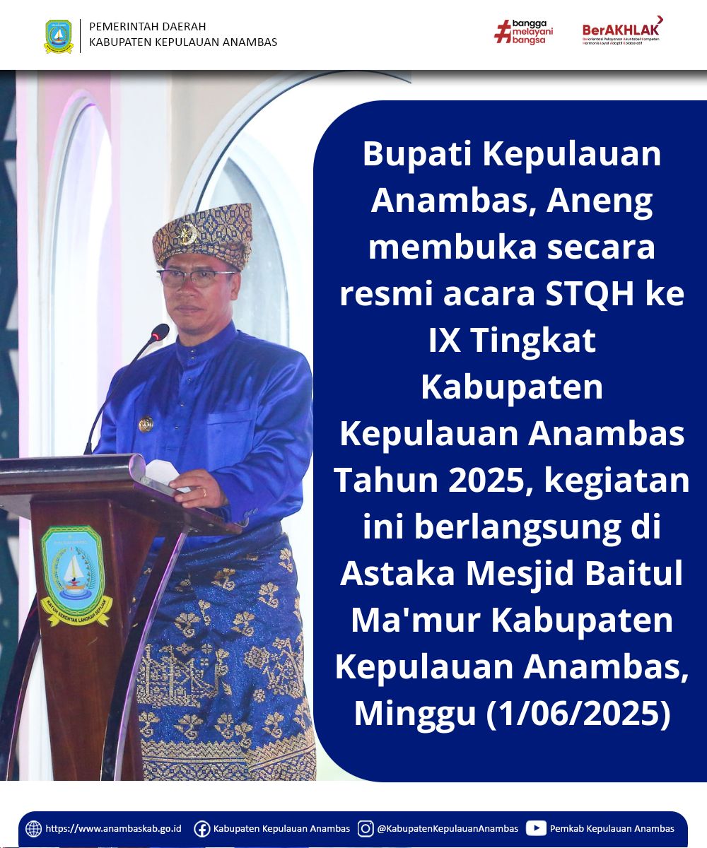 InfoPublik, Anambas - Bupati Kepulauan Anambas Aneng membuka secara resmi STQH ke IX Tingkat Kabupaten Kepulauan Anambas Tahun 2025 di Astaka Mesjid Agung Baitul Ma'mur Kabupaten Kepulauan Anambas, (Minggu,01/06/2025).