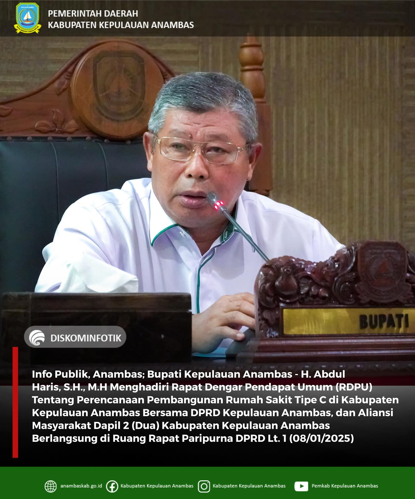 InfoPublik, Anambas - Bupati Kepulauan Anambas H. Abdul Haris, S.H., M.H Menghadiri Rapat Dengar Pendapat Umum (RDPU) Tentang Perencanaan Pembangunan Rumah Sakit Tipe C di Kabupaten Kepulauan Anambas Bersama DPRD Kabupaten Kepulauan Anambas dan Aliansi Masyarakat Dapil 2 (Dua) Kabupaten Kepulauan Anambas Berlangsung di Ruang Rapat Paripurna DPRD Lantai I (08/01/2025)