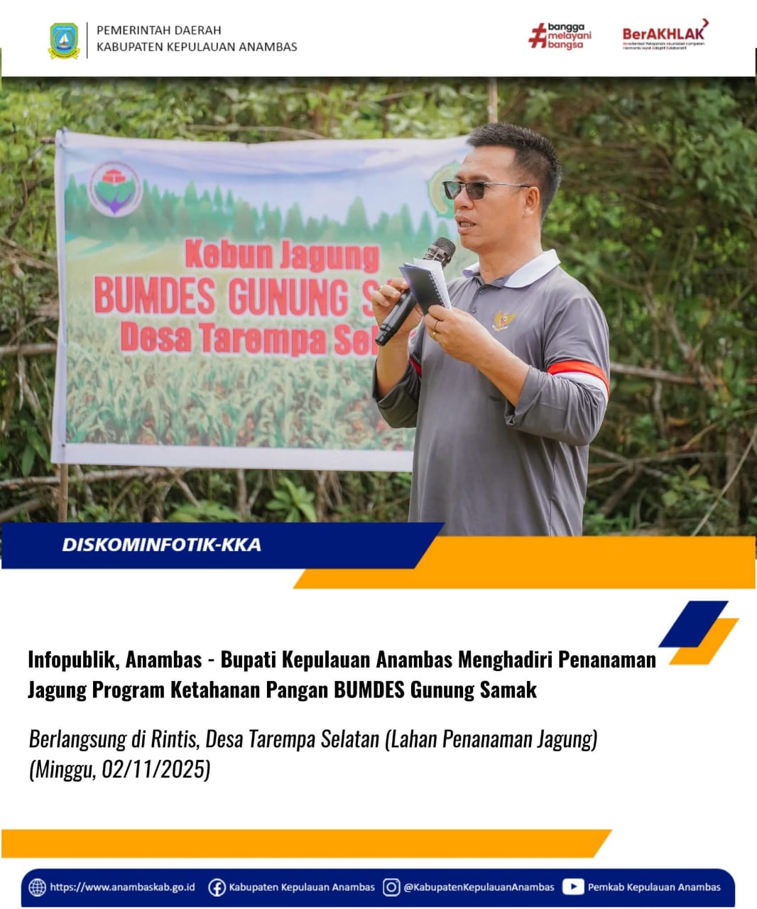 Infopublik, Anambas - Bupati Kepulauan Anambas Menghadiri Penanaman Jagung Program Ketahanan Pangan BUMDES Gunung Samak Berlangsung di Rintis, Desa Tarempa Selatan ( Lahan Penanaman Jagung ) ( Minggu, 02/11/2025 )