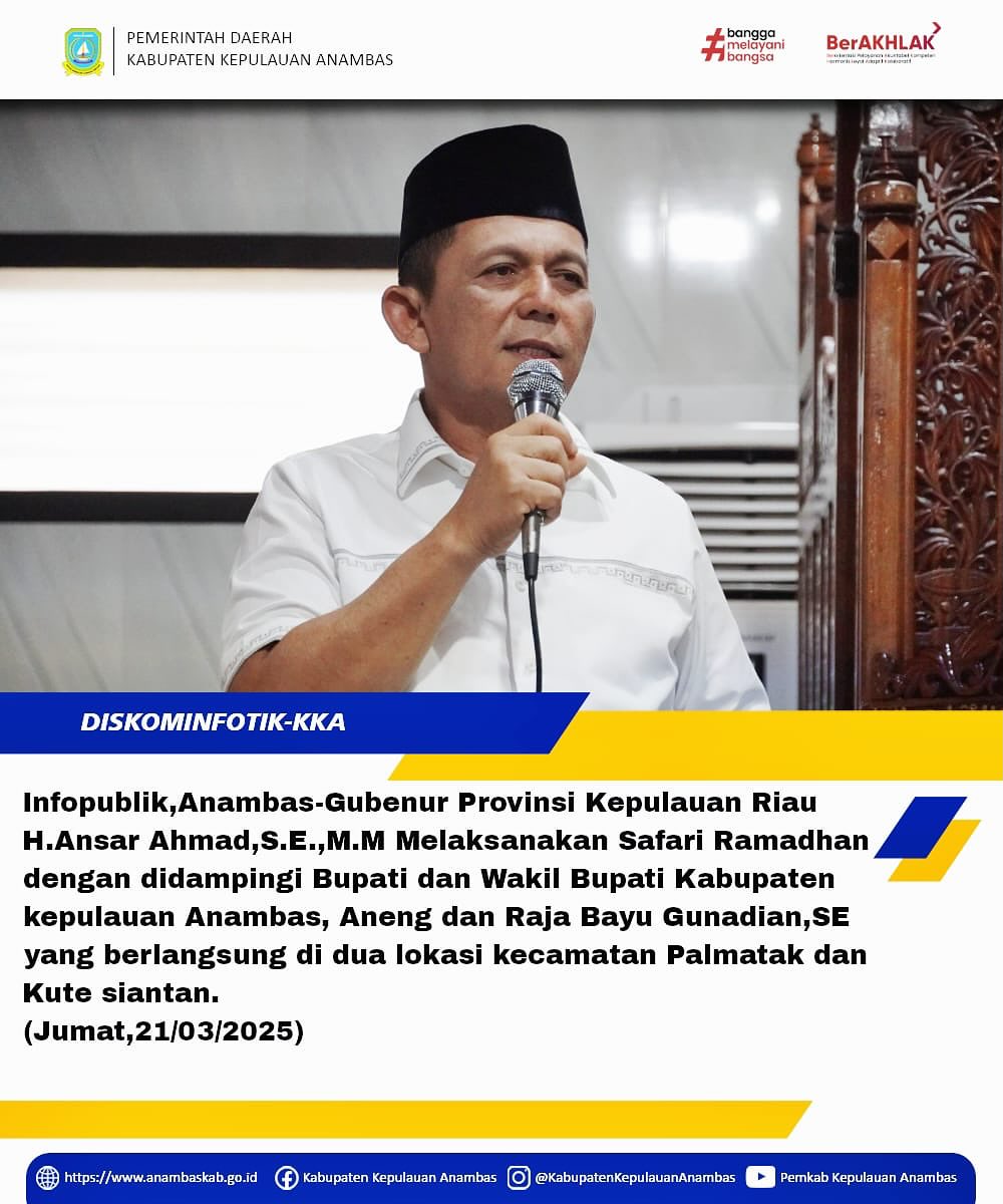 InfoPublik, Anambas - Gubernur Kepulauan Riau H. Ansar Ahmad, S.E., M.M Melaksanakan Safari Ramadhan dengan didampingi Bupati dan Wakil Bupati Kepulauan Anambas, Aneng dan Raja Bayu Gunadian, S.E yang berlangsung di dua lokasi Kecamatan Palmatak dan Kute Siantan ( Jumat,21/03/2025)