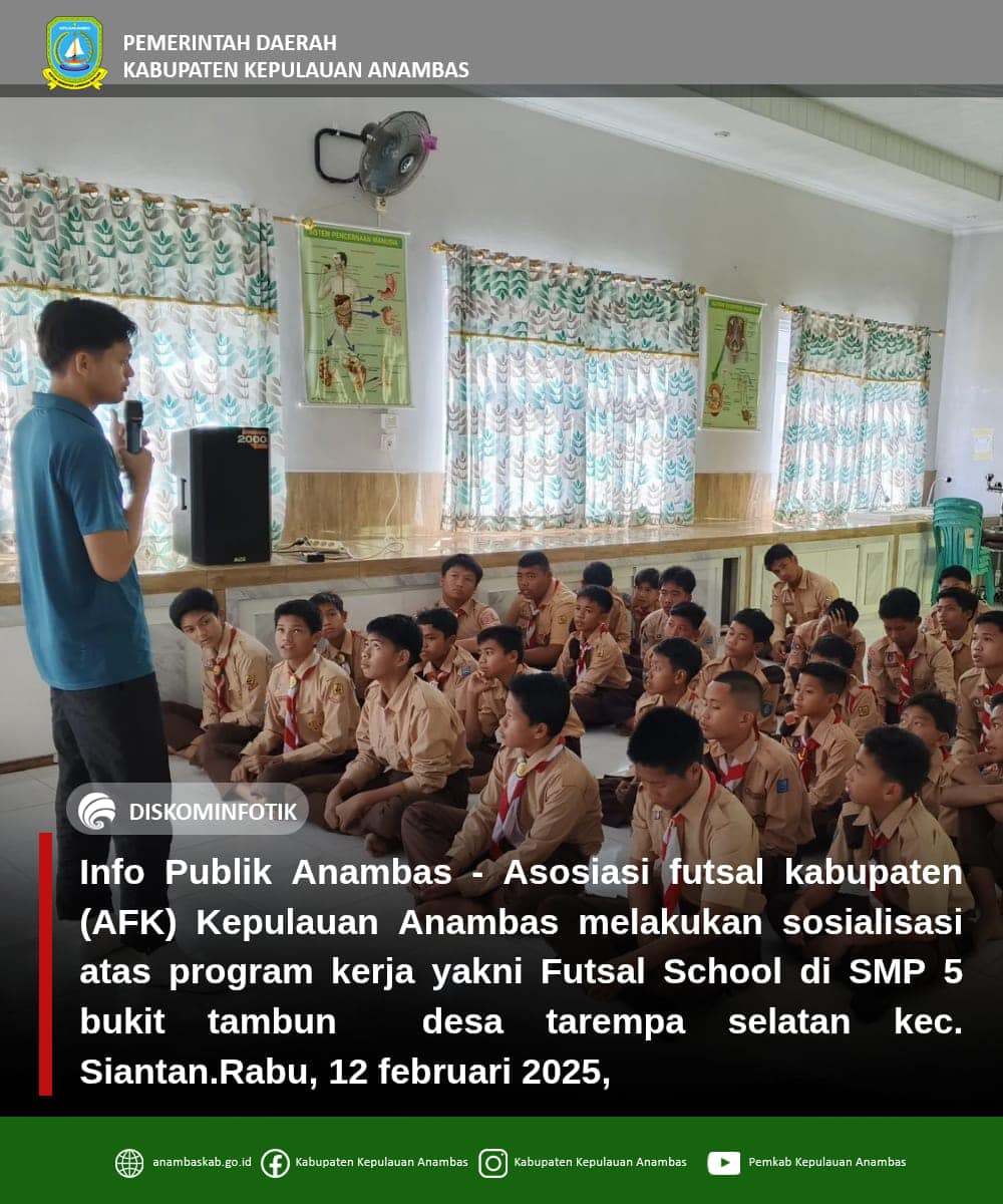InfoPublik, Anambas - Rabu, 12 februari 2025, Asosiasi futsal kabupaten (AFK) Kepulauan Anambas melakukan sosialisasi atas program kerja yakni Futsal School di SMP 5 bukit tambun desa tarempa selatan kec. Siantan. Kegiatan ini kami akan fokuskan dulu di semua sekolah yang ada di wilayah pulau Siantan dan rencana akan dilaksanakan juga di sekolah yang ada di kecamatan lain.