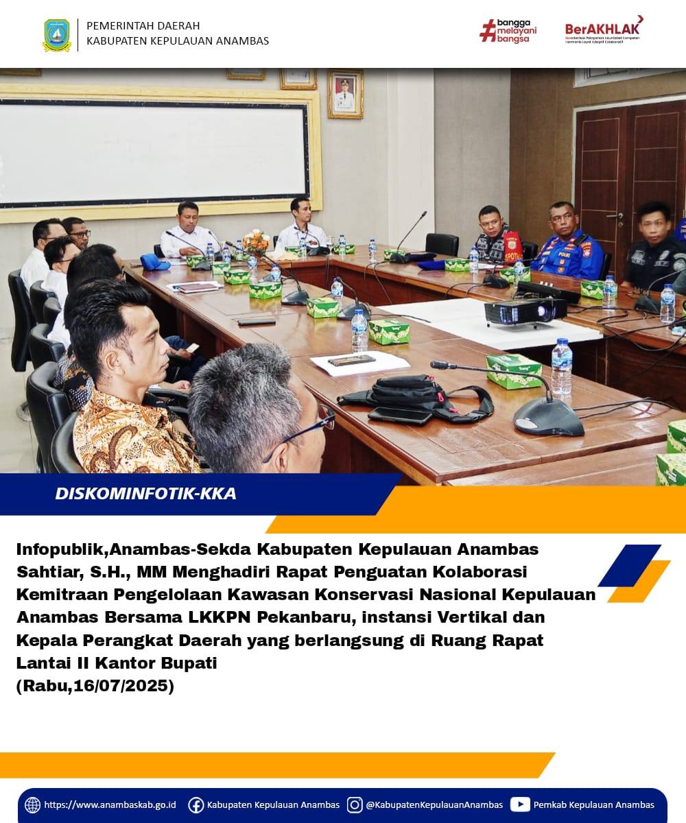 InfoPublik, Anambas - Sekretaris Daerah Kabupaten Kepulauan Anambas Sahtiar, S.H.,M.M memimpin Rapat Penguatan Kolaborasi Kemitraan Kawasan Konservasi Nasional Kepulauan Anambas, kegiatan berlangsung di Aula Rapat Prof M Zein Kantor Bupati Kepulauan Anambas Pasir Peti,(Rabu,16/07/2026).