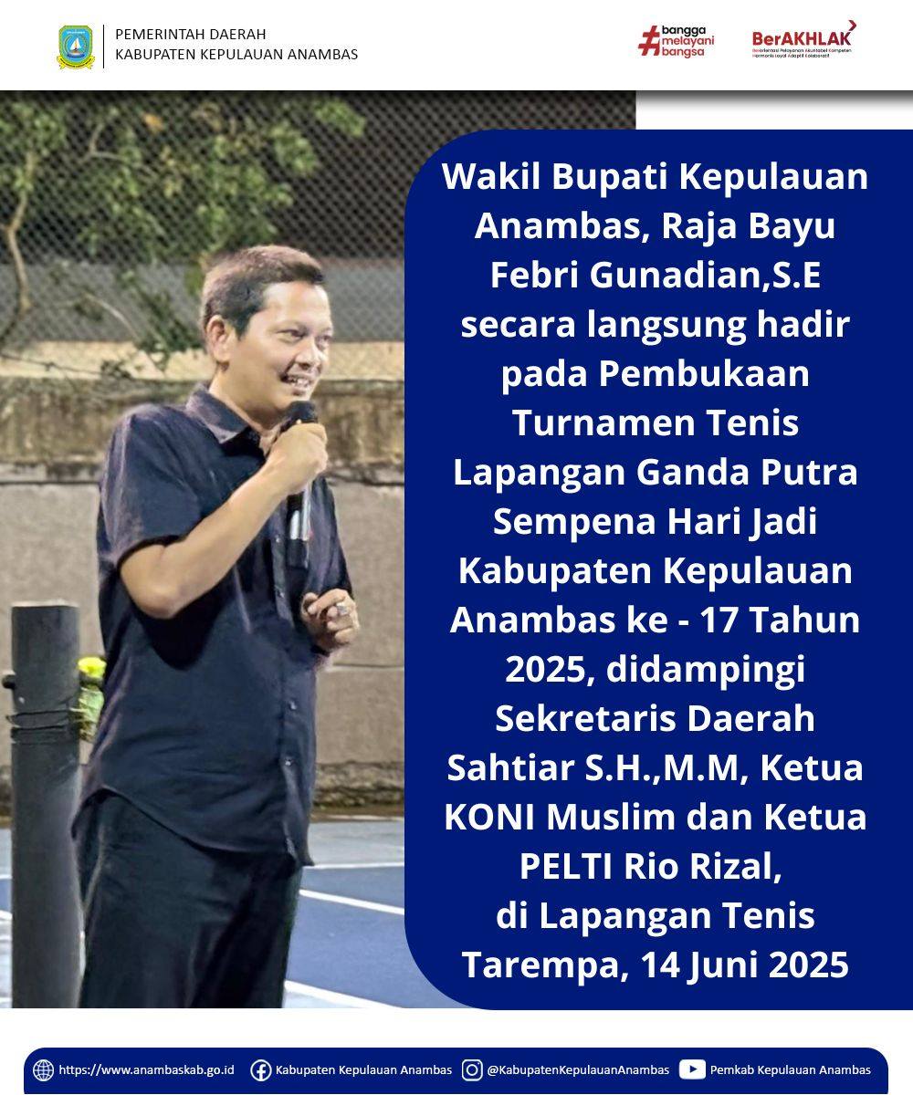 Infopublik,Anambas-Wakil Bupati Kabupaten Kepulauan Anambas Raja Bayu Febri Gunadian,S.E Secara Langsung Hadir Pada Pembukaan Turnamen Tenis Lapangan Ganda Putra Sampena Hari Jadi Kabupaten Kepulauan Anambas Ke-17 Tahun 2025, di Dampingi Sekretaris Daerah Sahtiar,S.H.,M.M Ketua KONI Muslim dan Ketua PELTI Rio Rizal di Lapngan Tenis Tarempa (Sabtu,14 Juni 2025)