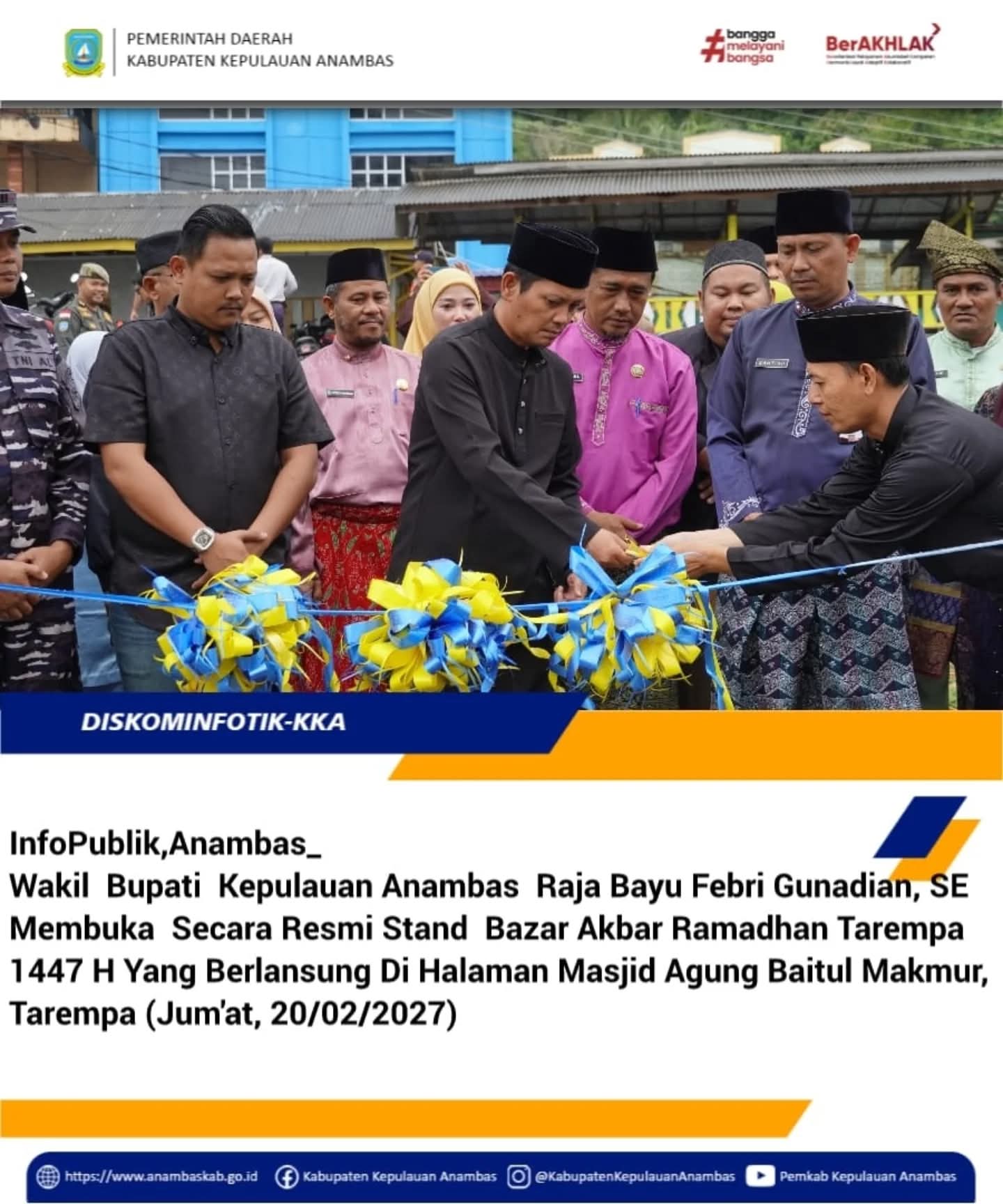 InfoPublik, Anambas - Wakil Bupati Kepulauan Anambas, Raja Bayu Febri Gunadian, S.E secara resmi membuka Stand Bazar Akbar Ramadhan 1447 Hijriah yang dipusatkan di Kawasan Mesjid Agung Baitul Ma'mur Kabupaten Kepulauan Anambas, Jum'at (20/02/2026). Di Tarempa Kecamatan Siantan. Pembukaan kegiatan berlangsung meriah dan penuh antusiasme masyarakat serta ditandai dengan prosesi pemotongan pita sebagai simbol dimulainya rangkaian kegiatan bazar selama bulan suci Ramadhan.