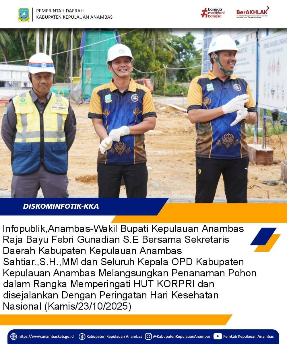 Infopublik, Anambas - Wakil Bupati Kepulauan Raja Bayu Febri Gunadian S,E Bersama Sekretaris Daerah Kabupaten Kepulauan Anamabas Sahtiar.,S.H.,MM dan Seluruh Kepala OPD Kabupaten Kepulauan Anambas Melangsungkan Penanaman Pohon dalam Rangka Memperingati HUT KORPRI dan disejalankan Dengan Peringatan Hari Kesehatan Nasional ( Kamis/23/10/2025)