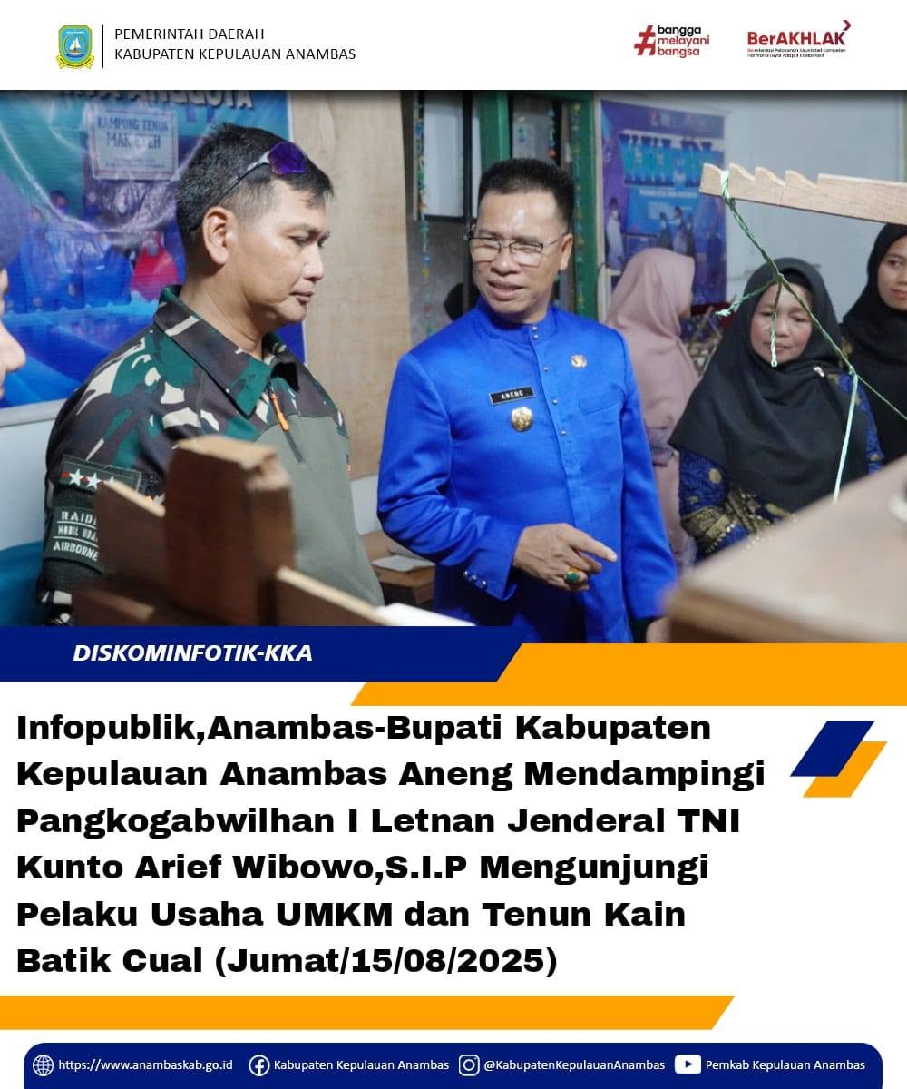 Pangkogabwilhan I didampingi Bupati Anambas mengunjungi para pelaku UMKM dan sentra tenun Batik Cual Anambas sebagai wujud dukungan terhadap pengembangan ekonomi kreatif dan kearifan lokal daerah. "Semoga menjadi motivasi bagi pelaku UMKM dan pengrajin tenun batik cual untuk terus berkarya, melestarikan budaya, dan memperkuat ekonomi tentunya,"ucap Aneng.