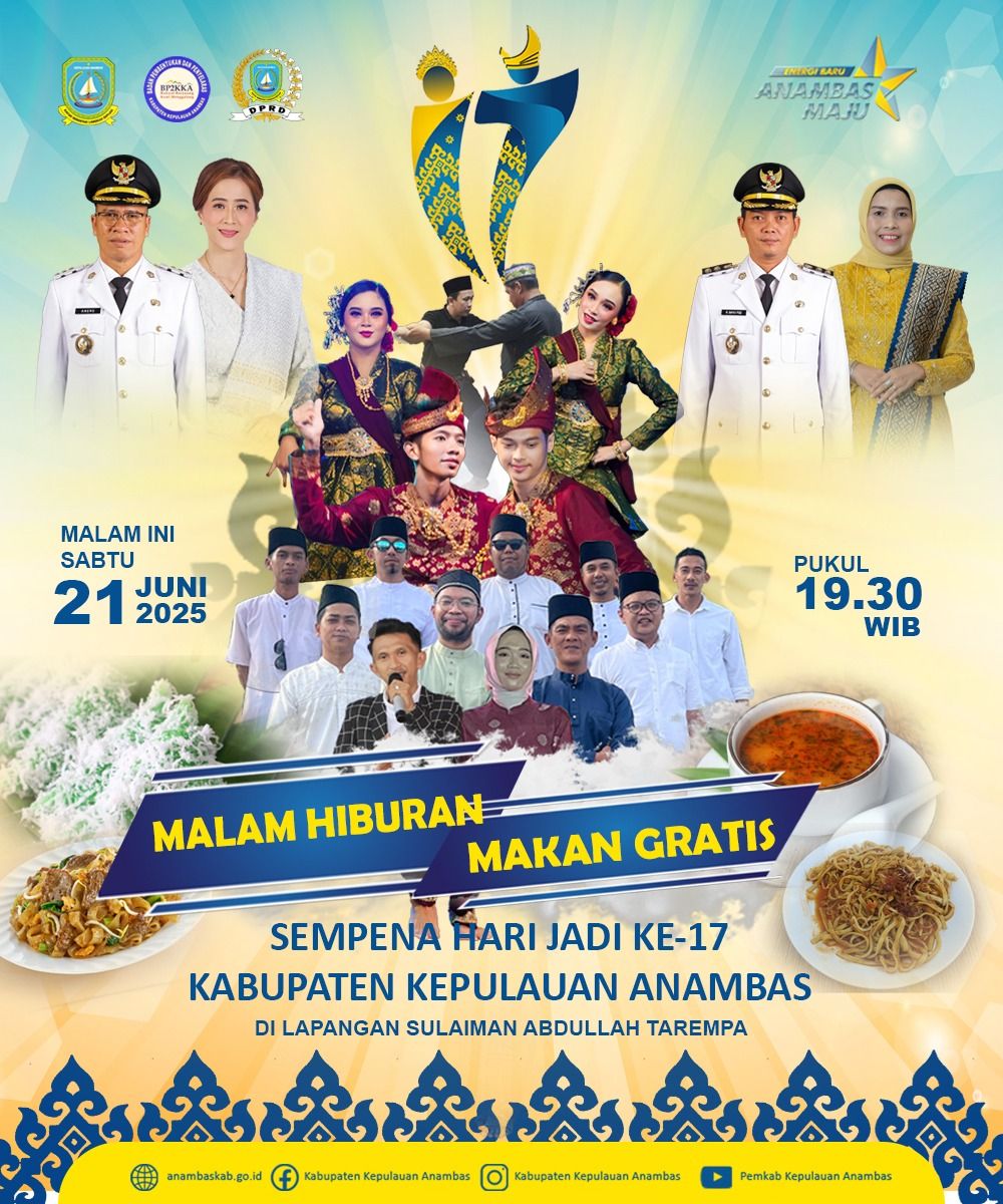 Satu hati membangun negeri. Dalam rangka Hari Jadi Kabupaten Kepulauan Anambas ke-17 mari lanjutkan seni karya dan prestasi! Jangan lewatkan Malam Hiburan untuk kita semua.