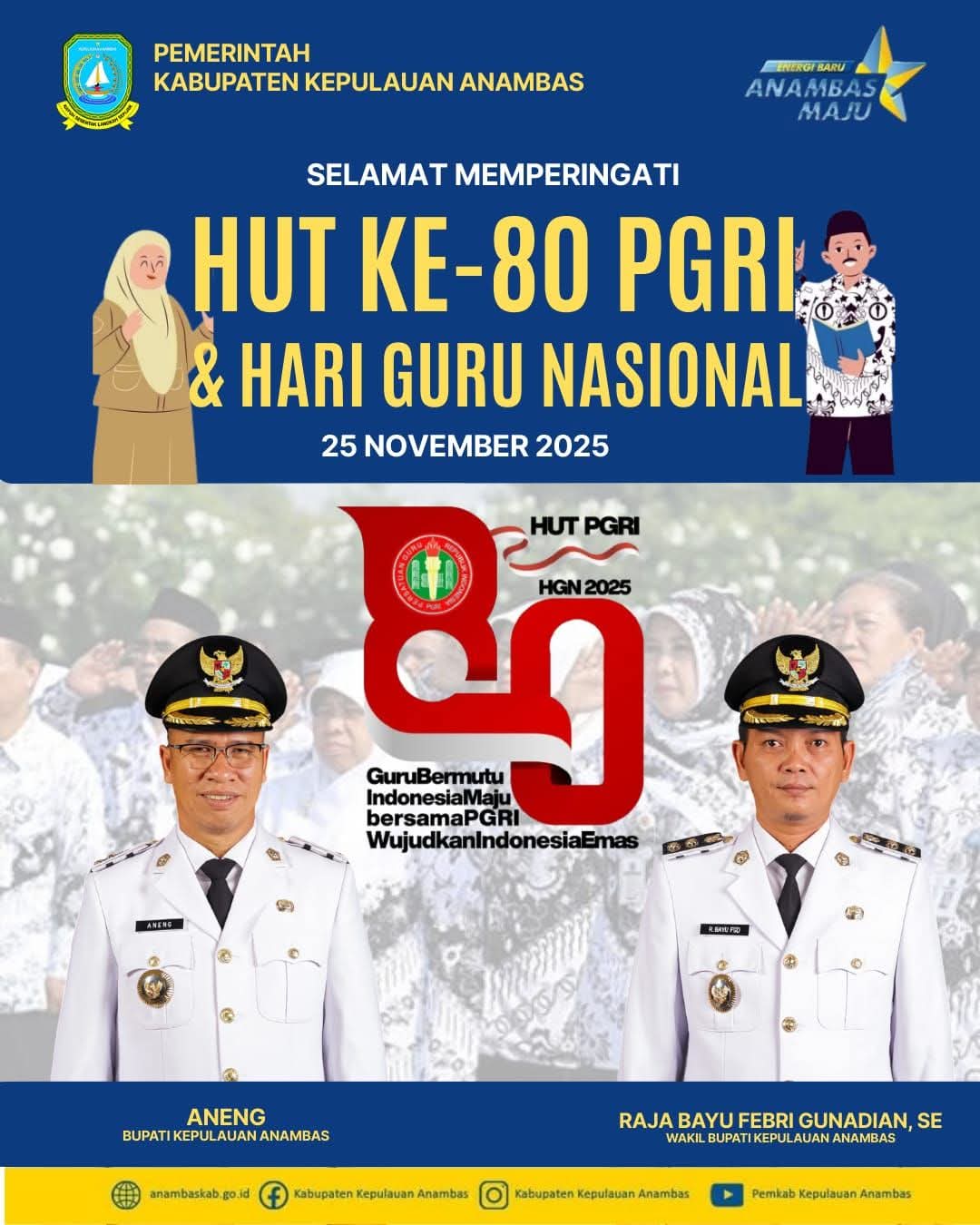 Selamat HUT PGRI ke 80! Terima kasih kepada seluruh guru yang terus mengabdi, menuntun, dan mencerdaskan bangsa khususnya di Kabupaten Kepulauan Anambas.
