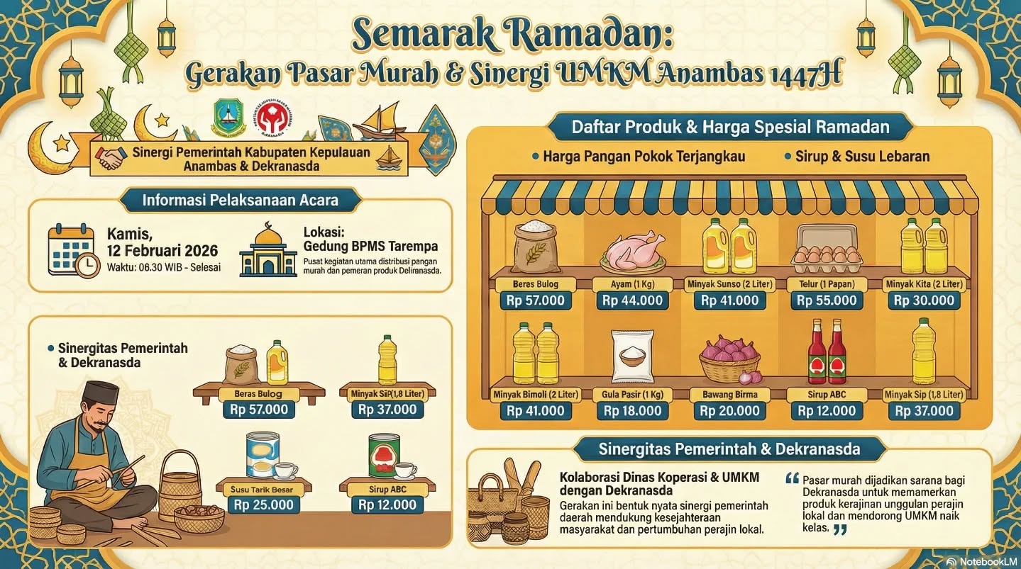 Di bulan penuh berkah ini, Pemerintah Kabupaten Kepulauan Anambas hadir lebih dekat untuk masyarakat melalui Gerakan Pasar Murah. Upaya nyata menjaga stabilitas harga dan memastikan kebutuhan pokok tetap terjangkau bagi seluruh masyarakat.