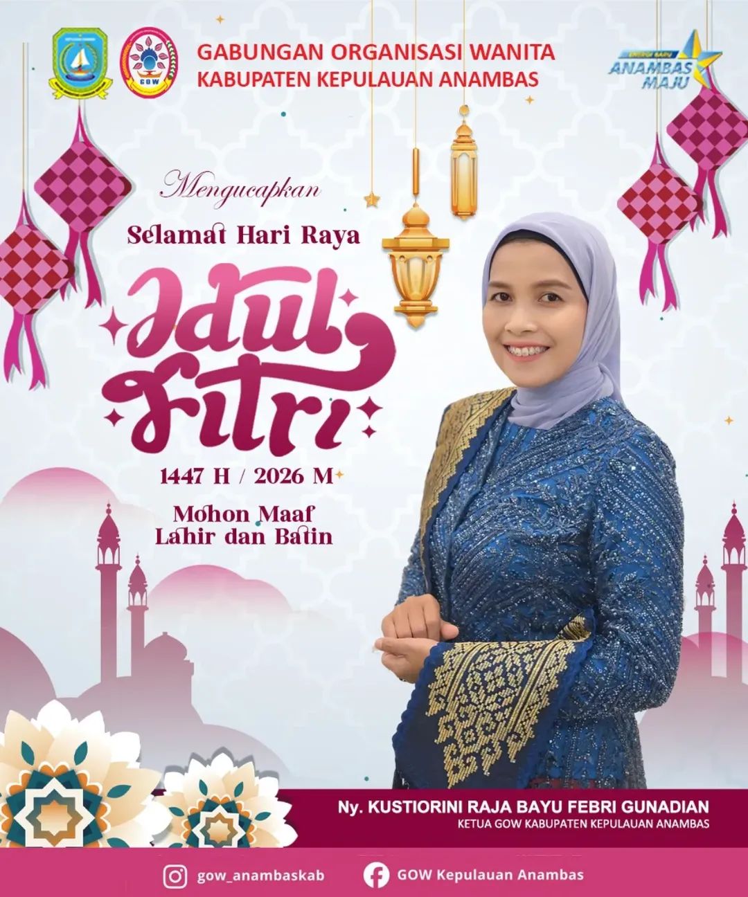 Dalam suasana penuh berkah di Hari Raya Idul Fitri 1447 Hijriah, saya selaku Ketua GOW Kabupaten Kepulauan Anambas, Ny. Kustiorini Raja Bayu mengucapkan Selamat Hari Raya Idul Fitri 1447 H / 2026 M.