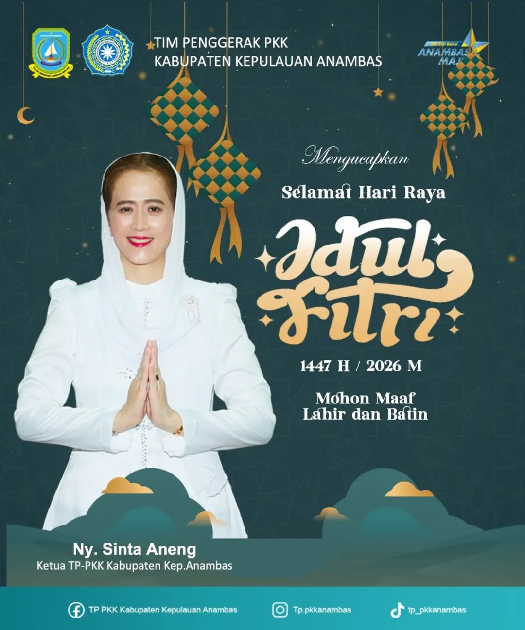 Di hari yang fitri ini, izinkan saya, Ny. Sinta Aneng selaku Ketua TP-PKK Kabupaten Kepulauan Anambas, mengucapkan Selamat Hari Raya Idul Fitri 1447 H / 2026 M.