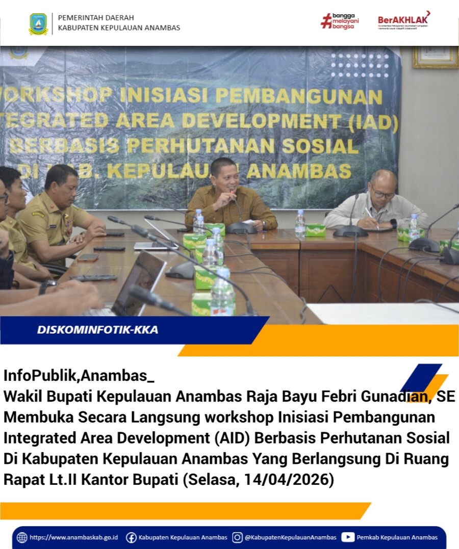 InfoPublik, Anambas - Wakil Bupati Kepulauan Anambas, Raja Bayu Febri Gunadian, S.E membuka secara langsung Workshop Inisiasi Pembangunan Integrated Area Development (IAD) berbasir perhutanan sosial di Kabupaten Kepulauan Anambas, kegiatan berlangsung di ruang rapat Lt II Kantor Bupati Kepulauan Anambas, Pasir Peti, Selasa (14/04/2026).